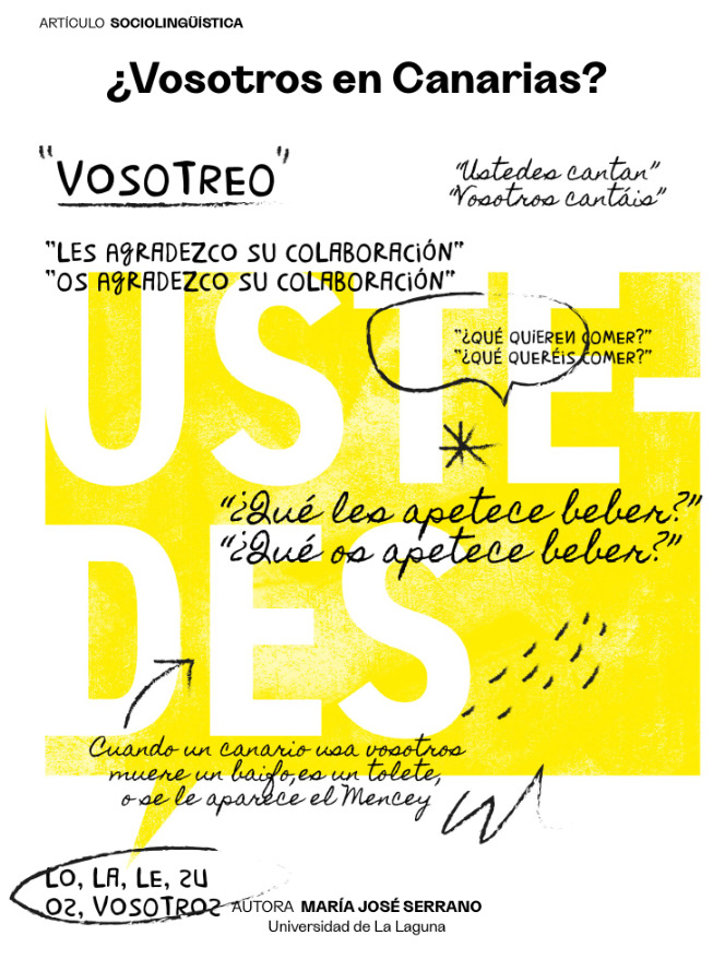 ¿Vosotros en Canarias? En la lengua española la segunda persona del plural puede expresarse de dos maneras: mediante los paradigmas de ustedes y vosotros. Lo que en lingüística se denomina “paradigma” incluye todas las funciones que pueden cumplir las formas de ustedes y vosotros, ya sea la de sujeto (“ustedes cantan; vosotros cantáis”) o la de objeto: “les canto (a ustedes) una canción”; “os canto (a vosotros) una canción”). Además, también se incluyen los posesivos (su casa; vuestra casa). Puesto que ambos paradigmas se refieren a un grupo de personas, destinatarios del mensaje, podría pensarse que son sinónimas o que significan lo mismo, pero en realidad no es así. Cualquier cambio en la forma implica un cambio en el significado. #Número 16 #Artículo #Artes y Humanidades #Hipótesis#María José Serrano 11 julio, 2024 No hay comentarios
