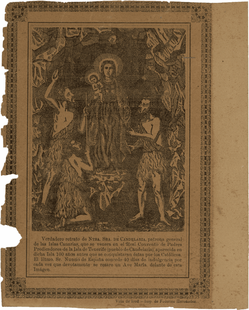 [Nuestra Señora de Candelaria] Icod de los Vinos : imp. de Federico Hernández, [1898?]. GRAB 55 El Fondo Antiguo de la Biblioteca de la Universidad de La Laguna posee además de su valioso patrimonio bibliográfico y documental una interesante colección de materiales gráficos. Sin embargo, algunos de los ejemplares están deteriorados debido al paso del…