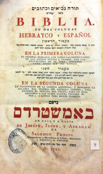 Torah Nevi’im u Khetuvim bi shne’amudim = Biblia en dos colunas hebrayco y español : en la primera coluna el original hebraico, con todas las perfecciones en las letras puntos y taamin, con las anotaciones de or tora poniendo cada coza en su lugar , en la segunda coluna, la traduccion en la lengua española, y buscamos la palabra mas propria en aquella lengua, para exprimir el sentido del texto; para lo qual añadimos a las vezes alguna palabra inter ( ) líneas para mayor clareza.– Amsterdam : en casa y a costa de Joseph, Iacob, y Abraham de Salomon Proops, estampadores y mercaderes de libros, hebraicos y españoles, Aº. 5522 [i.e.1762]