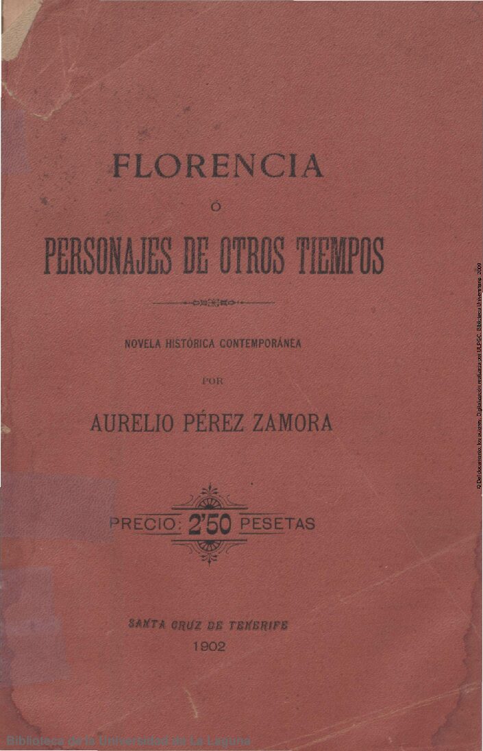 Aurelio Pérez Zamora, nacido en el Puerto de la Cruz, en la novela Florencia o personajes de otros tiempos publicada en Santa Cruz de Tenerife en 1913 por la Imprenta A. J. Benítez en la pág. 181
