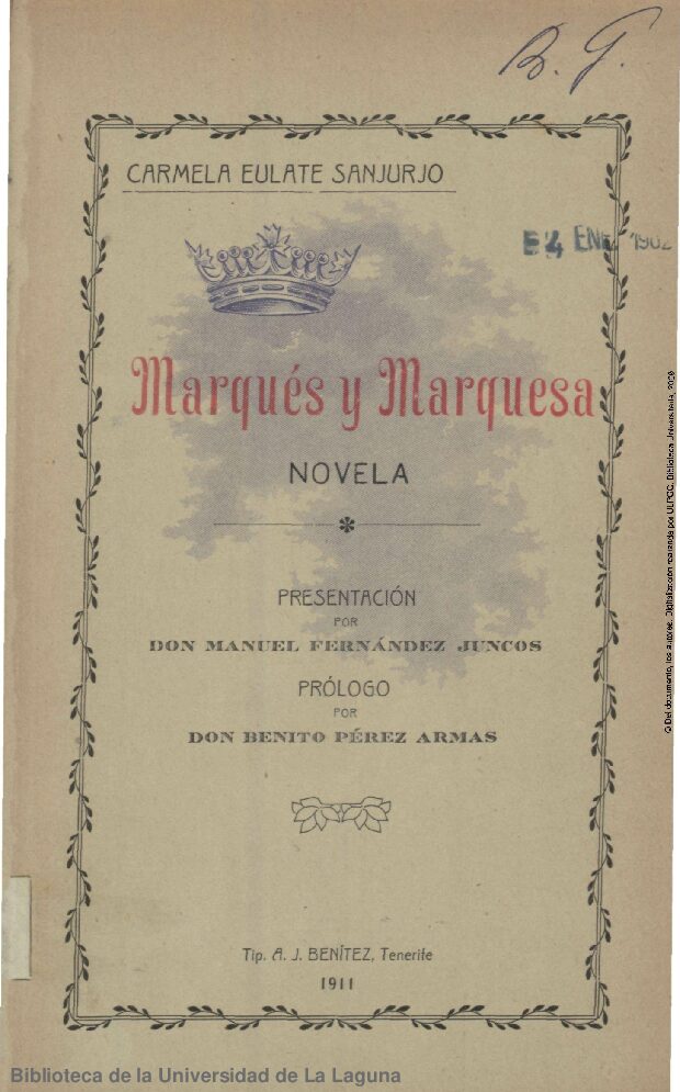 Marqués y marquesa : novela / Carmela Eulate Sanjurjo ; presentación por Manuel Fernández Juncos ; prólogo de Benito Pérez Armas.– Tenerife : [s.n.], 1911 (Tenerife : Tip. A.G. Benítez)