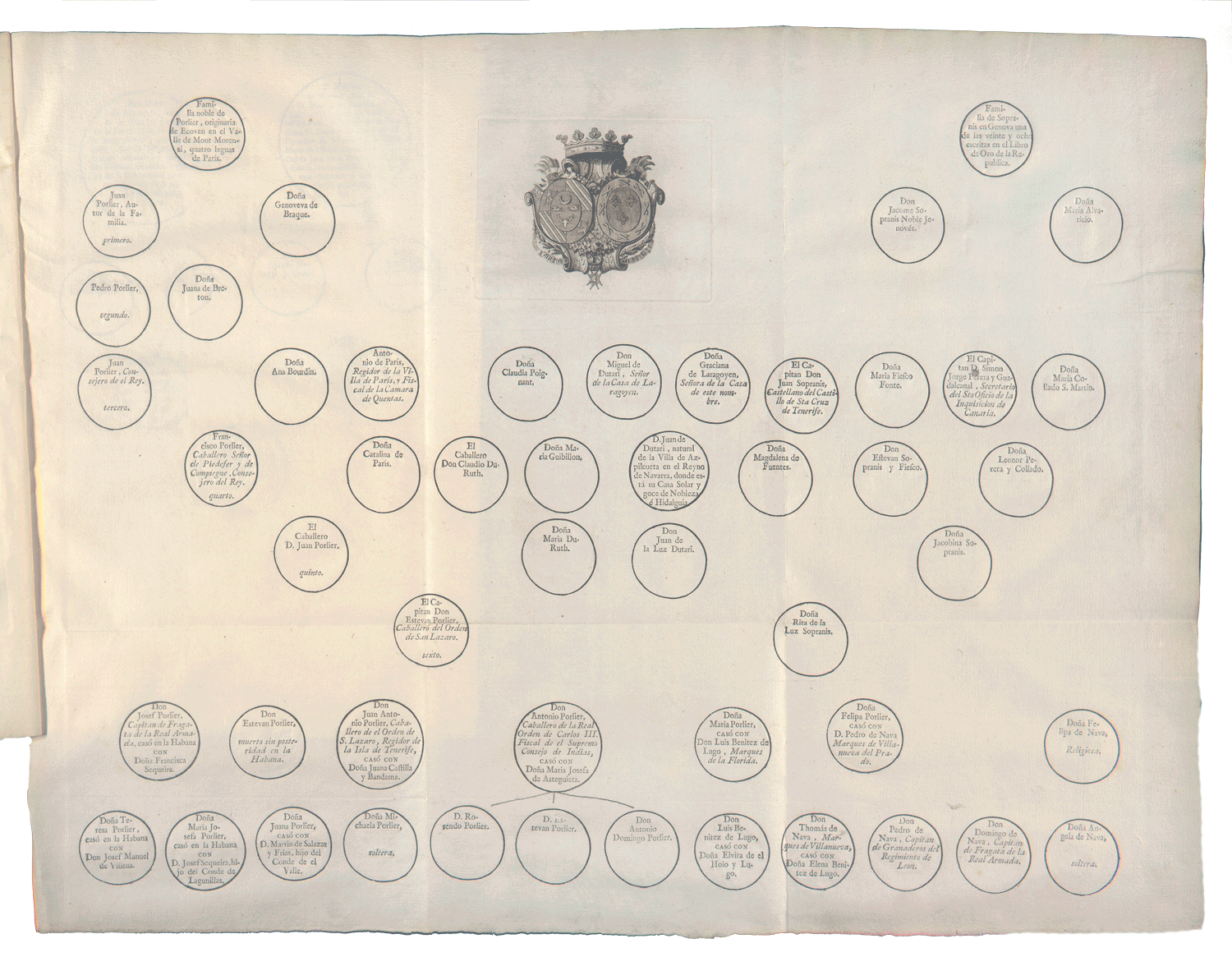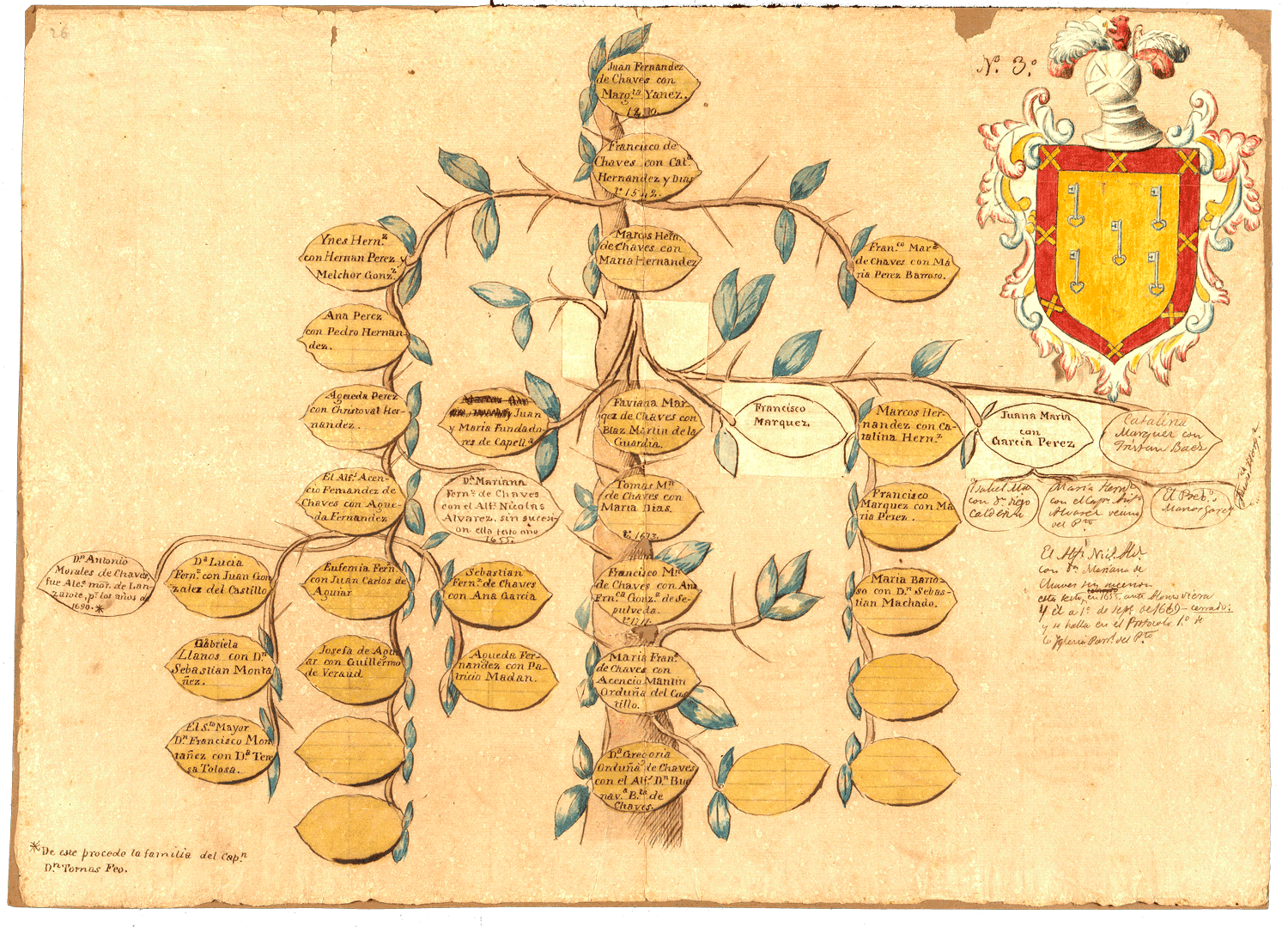 Como el árbol genealógico manuscrito de Álvarez Rixo de la descendencia de Juan Fernández de Chaves con Margarita Yanes, con escudo de armas de la Familia Chaves, en el que aparecen cinco llaves de oro en campo de gules, puestas en sotuer con los ojos hacia abajo, y bordura de gules con ocho aspas de oro. Remata un yelmo simple de acero pulido, de perfil y cerrado, y la cimera representa un león naciente con plumas de avestruz. El escudo está coloreado, recortado y pegado sobre la hoja.