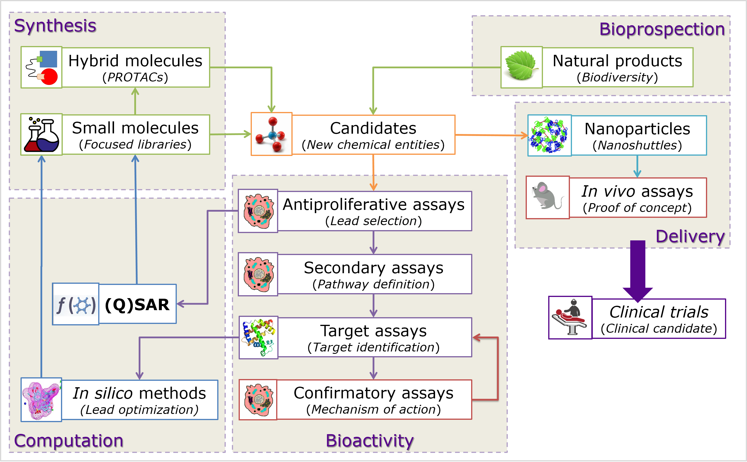 At BioLab we perform the biological evaluation of synthetic and natural compounds against a panel of representative human solid tumor cell lines. From this test, we determine if compounds are active and/or of interest to go into depth. We try to shed light on the mechanism of action by studying the effects of the products at a molecular level. Our ultimate goal is to identify the biological target(s) at which the active compound is directed. Through collaboration with external partners, we shuttle these molecules to increase their bioavailability, promote their blood circulation and cell internalization, reduce drug resistance and induce a controlled drug release at the target site. While the core activities of BioLab remain in this specific topic, in the past recent years we have expanded our capacities.