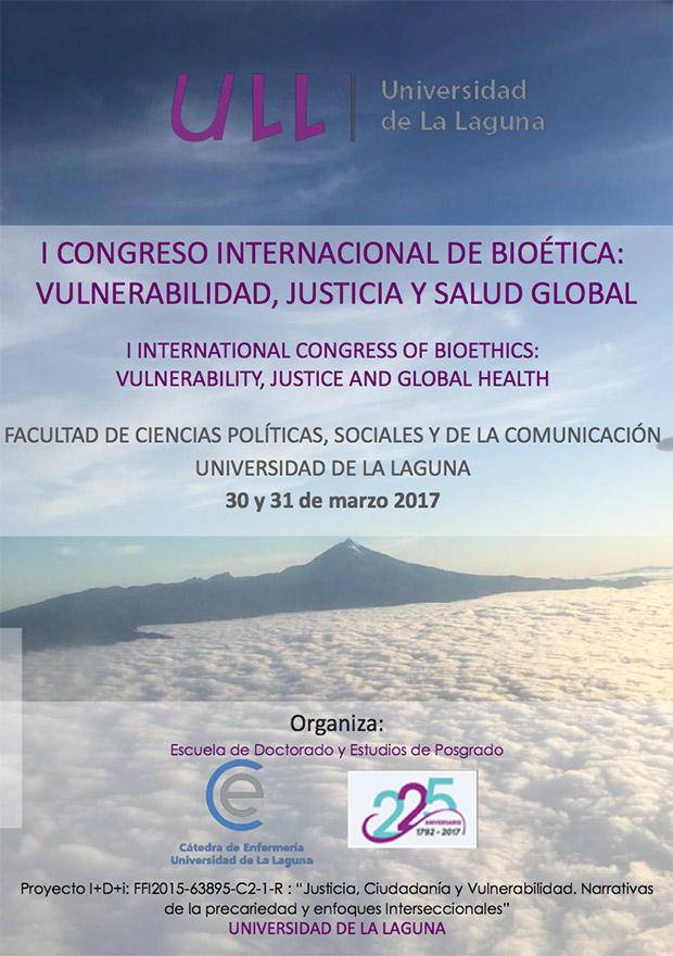 La Cátedra de Enfermería, la Escuela de Doctorado y Estudios de Posgrado, y el Proyecto I+D+i: FFI2015-63895-C2-1-R : “Justicia, Ciudadanía y Vulnerabilidad. Narrativas de la precariedad y enfoques Intersecciones”, vinculado al IUEM, organizan el I CONGRESO INTERNACIONAL DE BIOÉTICA: VULNERABILIDAD, JUSTICIA Y SALUD GLOBAL que tendrá lugar en la ULL los próximos días 30 y 31 de marzo.