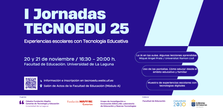La Cátedra Fundación MAPFRE Canarias de Tecnología y Educación (TECNOEDU) de la Universidad de La Laguna celebrará el jueves 20 y el viernes 21 de noviembre, en horario de 16:30 a 20:00 horas y en la Facultad de Educación, las I Jornadas TECNOEDU 2025 de Experiencias Escolares con Tecnología Educativa. El encuentro nace con el objetivo de compartir y difundir prácticas reales desarrolladas en centros de Canarias y de formación profesional, así como propiciar un debate informado sobre el uso de pantallas y el impacto de la inteligencia artificial en la enseñanza y el aprendizaje. La inscripción es gratuita y con plazas limitadas, por lo que se requiere reserva previa.