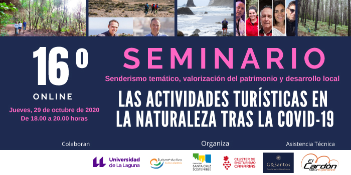 La edición número 16 del Seminario de Senderismo temático, valorización del patrimonio y desarrollo local se adapta en esta oportunidad a las circunstancias que se derivan de la pandemia y pretende sumar al diálogo constructivo sobre la actualidad de las actividades turísticas que se desarrollan en la naturaleza, contando con la participación de algunas de las personas protagonistas del sector en Canarias.