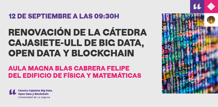El Aula Magna Blas Cabrera Felipe del Edificio de Física y Matemáticas de la Facultad de Ciencias de la Universidad de La Laguna acogerá el 12 de septiembre a partir de las 9:30 horas el acto de renovación de la Cátedra Cajasiete Big Data, Open Data y Blockchain, al que acudirán el Rector, Francisco Javier García, así como representantes de distintas entidades del Consejo Asesor de la Cátedra.