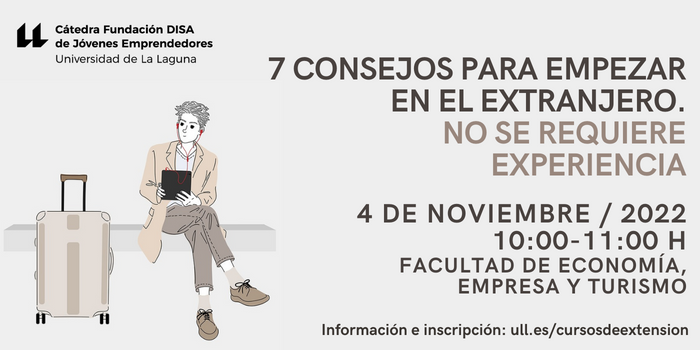 Actividad de Extensión Universitaria organizada por la Cátedra Fundación DISA de Jóvenes Emprendedores de la Universidad de La Laguna, que se celebrará en la Sala de Juntas de la Facultad de Economía, Empresa y Turismo el 4 de noviembre de 2022 en horario de 10:00 a 11:00 horas.