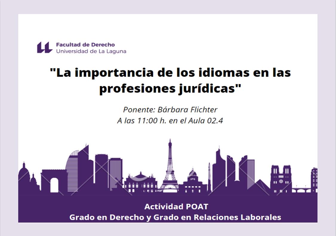 El viernes 18 de noviembre, en el aula 02.4 de la Facultad de Derecho a las 11:00 h. , se celebra la cuarta actividad en el marco del POAT. En esta actividad, tenemos como ponente invitada a Barbara Flichter, traductora para las instituciones de la Unión Europea. En su ponencia nos hablará sobre la importancia de los idiomas en las profesiones jurídicas.