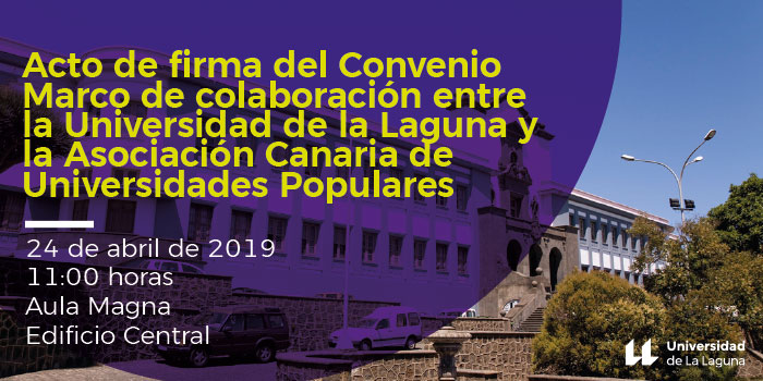 El miércoles día 24 de abril a las 11,00 horas, se celebrará en el Aula Magna del Campus Central un acto de firma de un Convenio Marco de colaboración entre la Universidad de la Laguna y la Asociación Canaria de Universidades Populares para el desarrollo de programas de actuación conjunta de carácter académico y de investigación. El acto estará presidido por el rector de la ULL, acompañado por el presidente de la FECAM y el presidente de la ACUP. El escritor y periodista Juan Cruz disertará una conferencia, con motivo de la firma del convenio