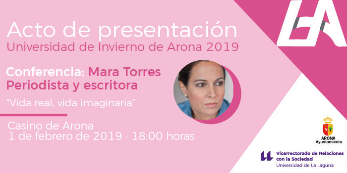 La actual presentadora del programa radiofónico El Faro y finalista del Premio Planeta en 2012, Mara Torres, será la encargada de impartir la conferencia inaugural de la tercera edición de la Universidad de Invierno de Arona, bajo el título Vida real, vida imaginaria, que tendrá lugar el próximo 1 de febrero, en el salón de actos del Casino de Arona, a las seis de la tarde.