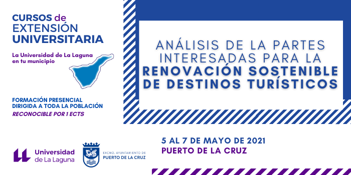 Curso de Extensión Universitaria organizado por el Vicerrectorado de Cultura, Participación Social y Campus Ofra y La Palma en colaboración con el Excmo. Ayuntamiento de Puerto de la Cruz, dentro de la programación de la convocatoria de Cursos de Extensión Universitaria en el ámbito municipal “Ayuntamientos 2021”, que se celebrará en modalidad presencial los días 5 al 7 de mayo de 2021.