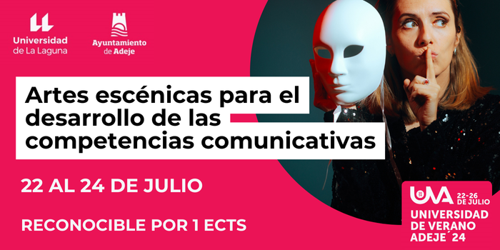 El curso «Artes escénicas para el desarrollo de las competencias comunicativas» forma parte de la programación de los Cursos de Extensión Universitaria de la “Universidad de Verano de Adeje 2024”, que se celebrará en el municipio de Adeje los días 22 al 24 de julio de 2024.