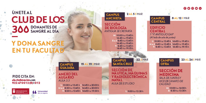 El Instituto Canario de Hemodonación y Hemoterapia va a realizar la segunda campaña de donación de sangre del curso académico 2020- 2021 en la Universidad de La Laguna. En esta ocasión la campaña comenzará el martes 2 de marzo y finalizará el miércoles 24 de marzo de 2021.