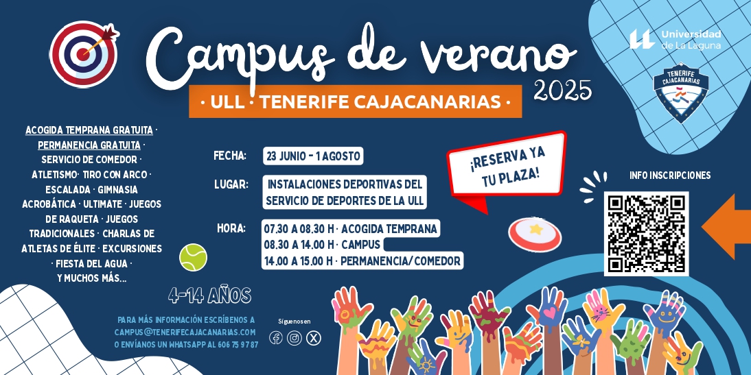 El Servicio de Deportes de la Universidad de La Laguna, en colaboración con Tenerife CajaCanarias, organiza este verano el Campus de verano 2025, destinado a niñas y niños de 4 a 14 años. La actividad se celebrará en las instalaciones deportivas universitarias en periodos de lunes a viernes entre el 23 de junio y el 1 de agosto.