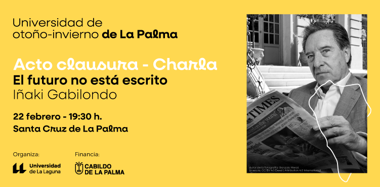 Este año contaremos con el periodista Iñaki Gabilondo en el acto de clausura de la “Universidad de Otoño-Invierno de La Palma 2023-2024”, quien impartirá una conferencia bajo el título «El futuro no está escrito», que tendrá lugar el próximo 22 de febrero en Teatro Circo de Marte en Santa Cruz de La Palma a las 19:30 horas.