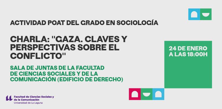 La Facultad de Ciencias Sociales y de la Comunicación organiza dentro de las actividades del POAT del Grado en Sociología una charla sobre «Gaza. Claves y perspectivas sobre el conflicto», que tendrá lugar el miércoles 24 de enero a las 18:00 horas en la Sala de Juntas del Edificio de la Facultad de Ciencias Sociales y de Derecho.
