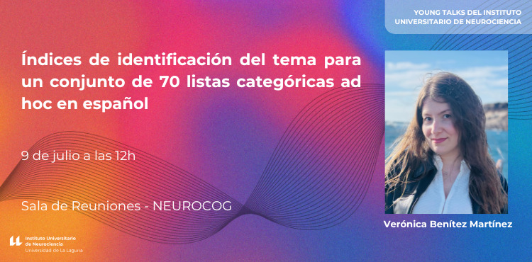 Siguiendo con el ciclo de las Young Talks, el próximo miércoles 9 de julio a las 12:00 horas la investigadora Verónica Benítez Martínez, de la Universidad de La Laguna, nos visitará para presentar su trabajo titulado «Índices de identificación del tema para un conjunto de 70 listas categóricas ad hoc en español». La charla será en la sala de reuniones del Neurocog.