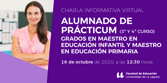 La Facultad de Educación ofrecerá una charla informativa sobre las prácticas externas a su alumnado de tercero y cuarto de los Grados de Educación Infantil y Educación Primaria, el viernes 16 de octubre de 2020, a las 12:30 horas vía telemática a través del siguiente enlace.