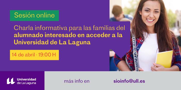 El Servicio de Información y Orientación de la Universidad de La Laguna, dependiente del Vicerrectorado de Estudiantes y Empleabilidad, realizará el 14 de abril, a las 19 horas, una sesión informativa, a través de la plataforma Google Meet, dirigida a las familias de los futuros estudiantes interesados en acceder a la Universidad de La Laguna, para informar de asuntos relacionados con la estancia de sus hijos e hijas en la misma, el acceso a los grados, el alojamiento, la oferta de becas y ayudas disponibles en el sistema universitario así como los servicios que la Universidad de La Laguna pone a disposición de su alumnado. En la sesión abriremos un turno de preguntas para que las personas asistentes puedan plantear sus dudas.