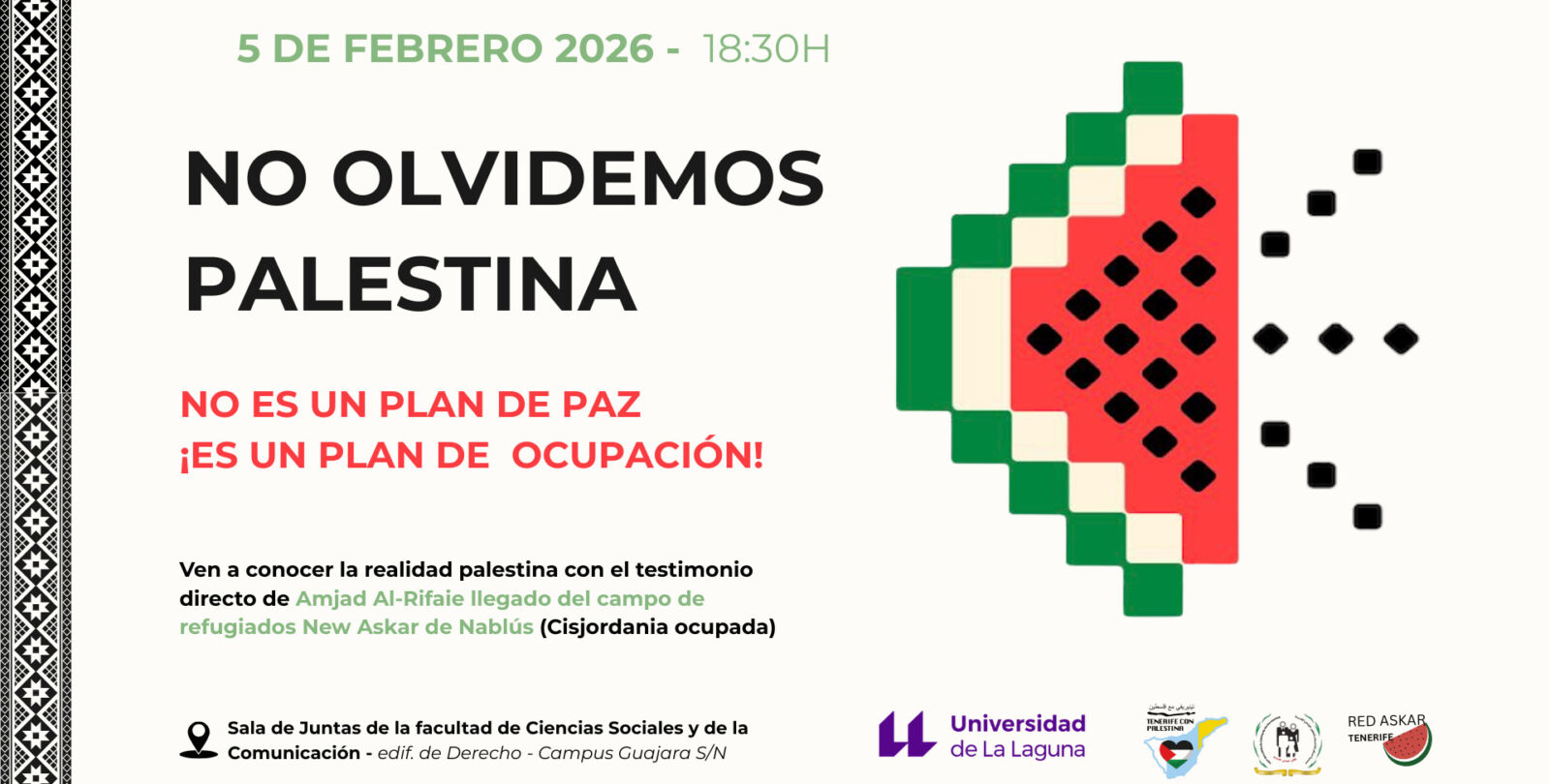 El próximo miércoles 5 de Febrero, a las 18,30 horas, la sala de Juntas de la facultad de Ciencias Sociales y de la Comunicación (Edif de Derecho-Campus Guajara) de la Universidad de La Laguna, acogerá una charla sobre la situación palestina actual tras el cese de la ofensiva sobre la franja de Gaza. Contaremos con el relato de primera mano de Amjad Al-Rifaie, máximo responsable de la Asociación Palestina de Askar.