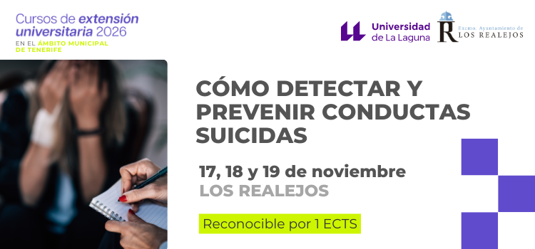 Los Realejos acoge el curso «Cómo detectar y prevenir conductas suicidas», organizado conjuntamente por el Vicerrectorado de Cultura y Extensión Universitaria y el Excmo. Ayuntamiento de Los Realejos, dentro de la programación de los Cursos de Extensión Universitaria en el ámbito municipal “Ayuntamientos 2026”, que se celebrará los días 17, 18 y 19 de noviembre de 2026.