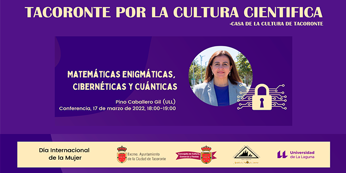 El Ayuntamiento de Tacoronte, con la colaboración de la Sociedad «Isaac Newton» y la Universidad de La Laguna, organizan una semana de actividades en torno a la divulgación de la Ciencia cuyas protagonistas son mujeres. El día 17 de marzo, de 18:00 a 19:30 horas, tendrá lugar la conferencia «Matemáticas Enigmáticas, Cibernéticas y Cuánticas», en la Casa de la Cultura de Tacoronte.