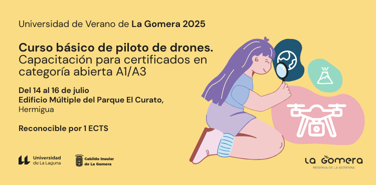 Hermigua acoge el curso de Extensión Universitaria «Curso básico de piloto de drones. Capacitación para certificados en categoría abierta A1/A3», que se celebrará los días 14, 15 y 16 de julio, en el marco de la “Universidad de Verano de La Gomera 2025”.