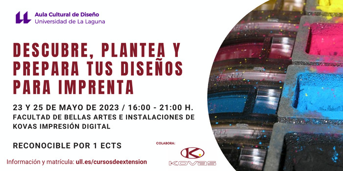 El Aula Cultural de Diseño de la Universidad de La Laguna, con la colaboración de Kovas Impresión Digital, organizan este curso que se celebrará los días 23 y 25 de mayo, en horario de 16:00 a 21:00 horas en la Facultad de Bellas Artes y las instalaciones Kovas en Santa Cruz de Tenerife.