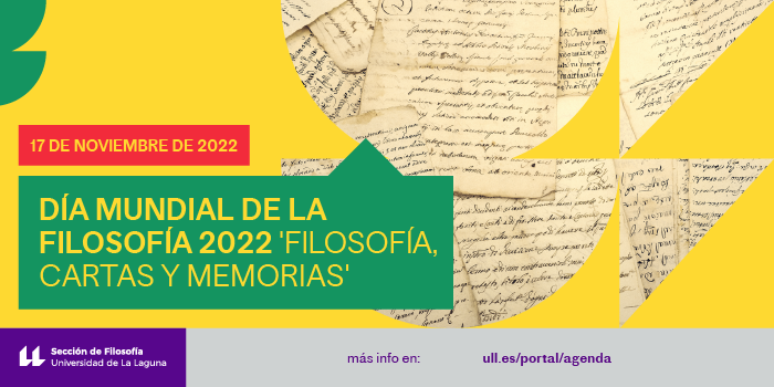 La Sección de Filosofía de la Universidad de La Laguna celebra un año más, el 17 de noviembre, el Día Mundial de la Filosofía. El tema elegido para este año es «Filosofía. Cartas y memorias». Se trata de centrarse en la correspondencia entre filósof@s y en las memorias de filósof@s. El tema cubre todas las áreas, épocas y corrientes así que nos gustaría que hubiera mucha participación.
