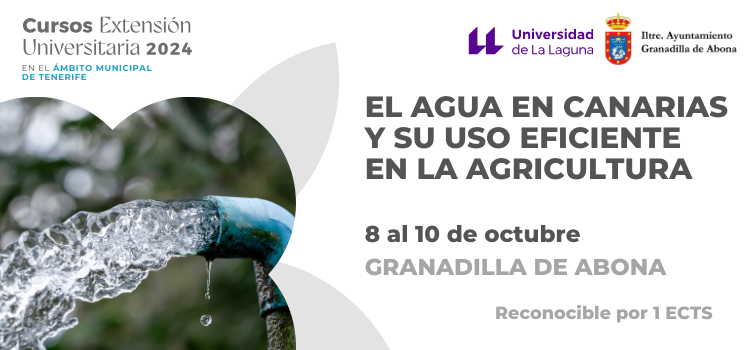 Granadilla de Abona acoge el curso «El agua en Canarias y su uso eficiente en la agricultura», organizado conjuntamente por el Vicerrectorado de Cultura y Extensión Universitaria y el Ilustre Ayuntamiento de Granadilla de Abona, dentro de la programación de los Cursos de Extensión Universitaria en el ámbito municipal “Ayuntamientos 2024”, que se celebrará los días 8, 9 y 10 de octubre de 2024.