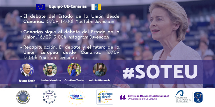 El Centro de Documentación Europea de la ULL, a la vista de este acontecimiento, coorganiza con otras entidades europeístas de Canarias tres sesiones en los que analizaremos la previa al debate el 15 de septiembre a las 17.00 y una recapitulación tras el debate a las 17.00 y teniendo como eje el interés de Canarias en las prioridades de la Unión Europea. Contaremos con la participación de Jaume Duch, Portavoz y Director General de Comunicación del Parlamento Europeo; Javier Mendoza, Economista y Profesor de Economía en la ULL; Cristina Tavío, ex-Vicepresidenta del Parlamento de Canarias y jurista; y Adrián Plasencia, traductor intérprete en la Dirección General de Comercio de la Comisión Europea, entre otros. Podrás seguir el evento en el canal de YouTube de Juveucan en este enlace.
