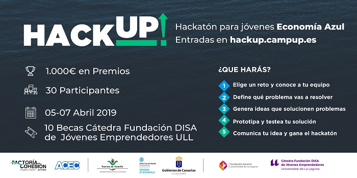 La Cátedra Fundación DISA de Jóvenes Emprendedores ULL colabora con la Factoría de Cohesión y ACEC en el desarrollo del HackUP!, un maratón continuo de 24 horas que se realizará el 5, 6 y 7 de abril de 2019.