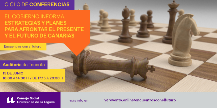 La séptima sesión de Encuentros con el Futuro, organizada por el Consejo Social de la Universidad de La Laguna, se centrará en esta ocasión en El gobierno informa: Estrategias y planes para afrontar el presente y el futuro de Canarias. Por la tarde, se hablará de Geopolítica. La situación geográfrica de Canarias y su vocación tricontinental, y la presentación del programa internacional Campus África de la Universidad de La Laguna.