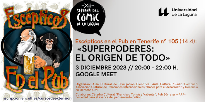 El Aula Cultural de Divulgación Científica, el Aula Cultural «Radio Campus», la Asociación cultural de relaciones internacionales «Hacer para el Desarrollo» y Docencia en Derecho Civil organizan esta conferencia dentro de la XIII Semana del Cómic de La Laguna que se celebrará en modalidad online el 3 de diciembre de 2023 de 20:00 a 22:00 horas.