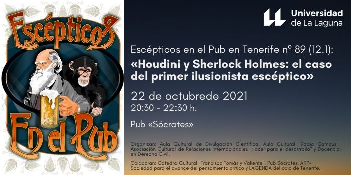 La conferencia abre la duodécima temporada de Escépticos en el Pub en Tenerife con una charla centrada en el la figura de Harry Houdini, el célebre escapista austrohúngaro y en su relación con sir Arthur Conan Doyle, creador del detective Sherlock Holmes.
