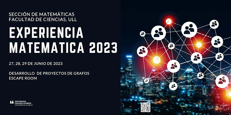 La experiencia Matemática 2023 es una actividad de tres días destinada al alumnado de Bachillerato (preferiblemente de primer curso) y último curso de Secundaria, con interés por las matemáticas. Durante los tres días desarrollarán proyectos relacionados con la Teoría de grafos que en una sesión final tendrán que presentar. Además disfrutarán de un divertido escape room.