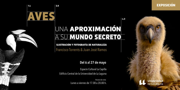 El Espacio Cultural La Capilla, situado en el Edificio Central de la Universidad de La Laguna, acoge la exposición «Aves, una aproximación al mundo secreto de las aves» del ilustrador Francisco Torrents y el fotógrafo Juan José Ramos. El acto de inauguración tendrá lugar el 5 de mayo a las 19:00 horas y contará con la presencia de Juan Albino Méndez, Vicerrector de Cultura y Participación Social.