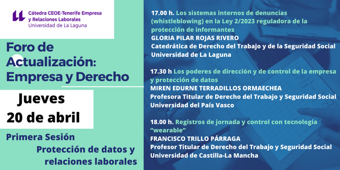 La Cátedra CEOE-Tenerife Empresa y Relaciones Laborales de la Universidad de La Laguna organiza, en el marzo del «Foro de Actualización: Empresa y Derecho», esta primera sesión sobre la protección de datos y relaciones laborales, que se celebrará en modalidad online el 20 de abril de 2023, en horario de 17:00 a 19:00 horas.