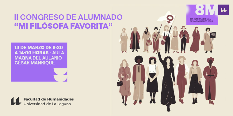 El viernes 14 de marzo, y como viene siendo habitual en la Sección de Filosofía de la Facultad de Humanidades de la Universidad de La Laguna, se celebra el Mes de las filósofas. Este años se continuará con la iniciativa emprendida el curso pasado y tendrá lugar un congreso de alumnado en torno al tema «Mi filósofa favorita».