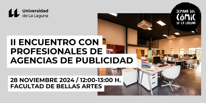 La Cátedra Cultural «Francisco Tomás y Valiente» y el Aula Cultural «Radio Campus», en el marco de la XIV Semana del Cómic de La Laguna, organizan este encuentro que se celebrará en la Facultad de Bellas Artes el 28 de noviembre de 2024 en horario de 12:00 a 13:00 horas.