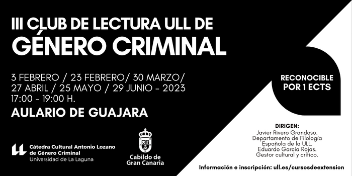 Actividad de Extensión Universitaria organizada por la Cátedra Cultural Antonio Lozano de Género Criminal en colaboración con el Cabildo Insular de Gran Canaria y el Departamento de Filología Española de la ULL, que se celebrará en modalidad presencial entre el 3 de febrero y el 29 de junio de 2023.
