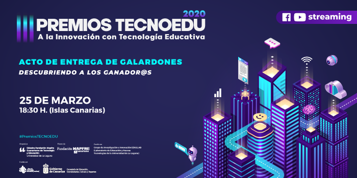 Los III Premios Tecnoedu 2020 a la innovación con tecnología educativa están convocados por la Cátedra Fundación MAPFRE Guanarteme de Tecnología y Educación en la Universidad de La Laguna, en los que colabora la Dirección General de Ordenación, Innovación, Promoción Educativa a través de ATE (Área de Tecnología Educativa) y el grupo EDULLAB (Laboratorio de Educación y Nuevas Tecnología de la Universidad de La Laguna).