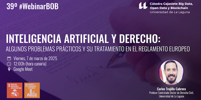 La inteligencia artificial está transformando el ámbito jurídico y plantea interrogantes fundamentales en la protección de los derechos. En el próximo webinar de la Cátedra Cajasiete de Big Data, Open Data y Blockchain se hablará sobre la «Inteligencia artificial y Derecho: algunos problemas prácticos y su tratamiento en el Reglamento europeo».