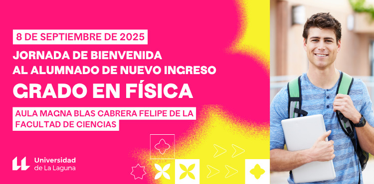 Con la intención de acoger especialmente al alumnado de nuevo ingreso que se incorpora a los estudios superiores del Grado en Física y Grado en Matemáticas se realiza una jornada de bienvenida que se celebrarán el 8 de septiembre en el Aula Magna Blas Cabrera Felipe, en el Edificio de Física y Matemáticas de la Facultad de Ciencias.