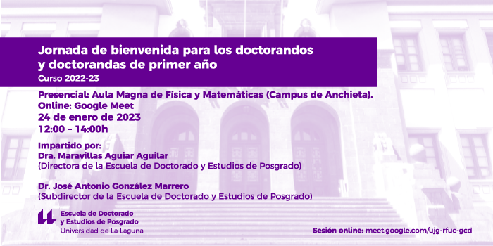 El martes 24 de enero a las 12:00h tendrá lugar la actividad informativa especial de bienvenida para las doctorandas y los doctorandos matriculados de primer año en el presente curso académico 2022-2023.