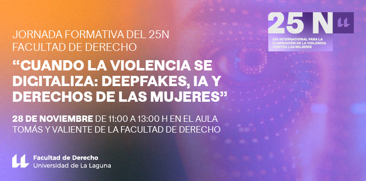 La jornada formativa con motivo del 25N de la Facultad de Derecho abordará cómo la inteligencia artificial está abriendo nuevas formas de violencia contra las mujeres, especialmente a través de los deepfakes de carácter sexual. Se analizará su impacto en la intimidad, la imagen, la voz y otros derechos de la personalidad, así como los riesgos que estas tecnologías suponen para la protección de datos y la dignidad de las víctimas. Se celebrará el viernes día 28 de noviembre, a las 11:00 horas, en el Aula Tomás y Valiente de la Facultad de Derecho, en el marco del 25N, Día Internacional de la Eliminación de la Violencia contra la Mujer.