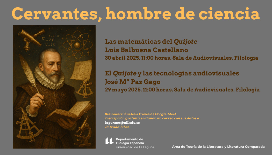 La primera de ellas tendrá lugar el miércoles 30 de abril a las 11:00 horas en la sala de audiovisuales del departamento de Filología, además de transmitirse de forma online. El ponente será Luis Balbuena Castellano e impartirá la conferencia: ‘Las matemáticas del Quijote’