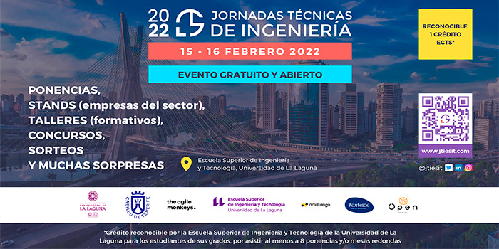 Las Jornadas Técnicas de Ingeniería 2022, tendrán lugar entre el 15 y 16 de febrero en la Escuela Superior de Ingeniería y Tecnología. El Acto de Apertura de las jornadas será el 15 de Febrero a las 9:30h en el edificio de la ESIT.
