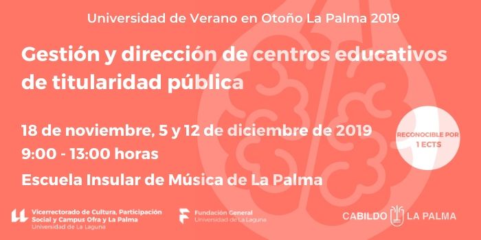 Este curso de Extensión Universitaria forma parte de la programación “Universidad de Verano en Otoño La Palma 2019” y se celebrará los jueves 28 de noviembre, 5 y 12 de diciembre de 2019 en horario de mañana.